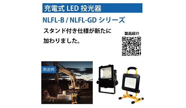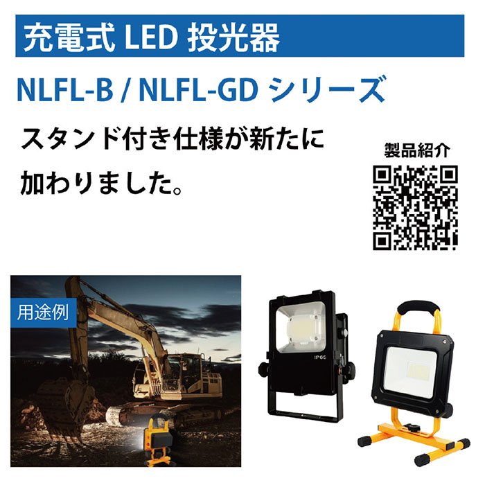 防雨設計でもあるので雨天時でも安心してご使用いただくことができ、オプション品のネオジム磁石を使用することで壁面や工場内などにも設置可能となっております。また、最大連続点灯時間6時間とすることで価格を抑えたNLFL-GDシリーズも販売を開始しました。スタンド付き仕様ですので床置き設置が可能です。