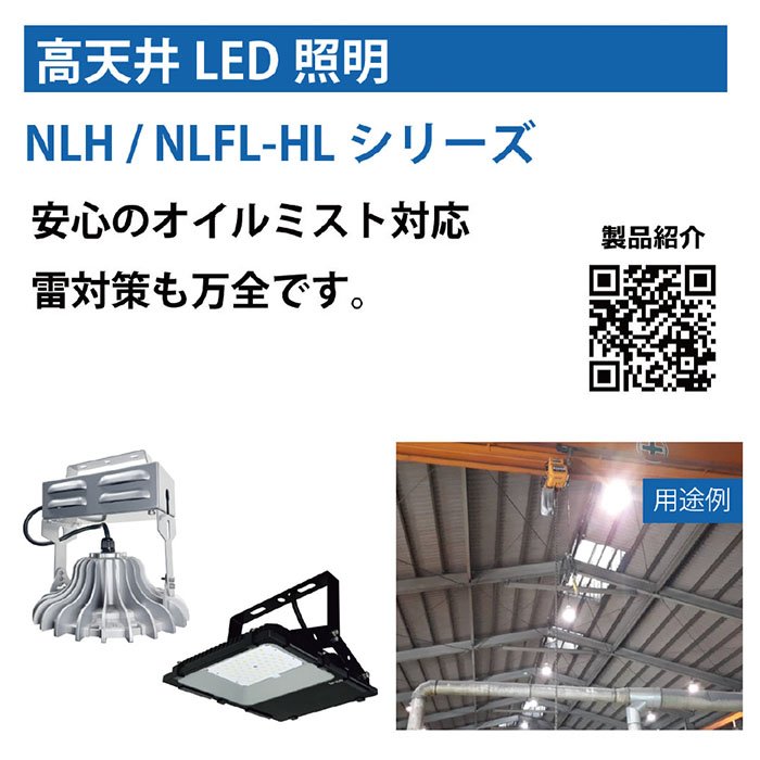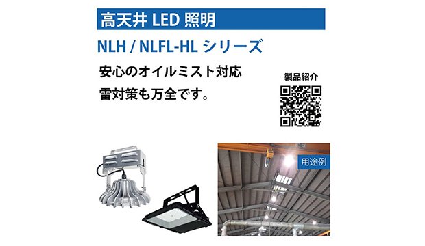 “耐オイルミスト”の技術を生かし開発されたNLHシリーズは突入電流やサージ、瞬間停電に対応しています。誘導電サージを迂回させる免電設計で、落雷や雷放電から製品を守ります。天井高が低めの工場においても、無駄無く広範囲を照射するNLFL-HLシリーズも好評発売中です。配光角が120°であることに加え、本製品は角度調整機能付きであるため全体的に照射したい場合や局部的な明るさが必要な場面にも対応しています。