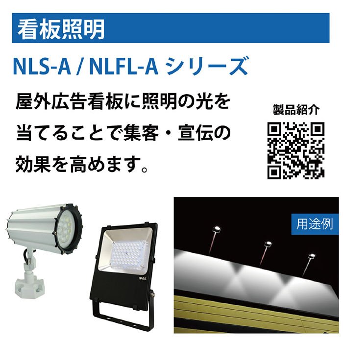 広告看板照明であるNLS-A、NLFL-Aシリーズは従来の製品群には無かった屋外照明です。スポット的に照射するNLS-Aに対し、NLFL-Aシリーズは広範囲に照射が可能であり、配光角や取付方法の選択肢も豊富になっています。