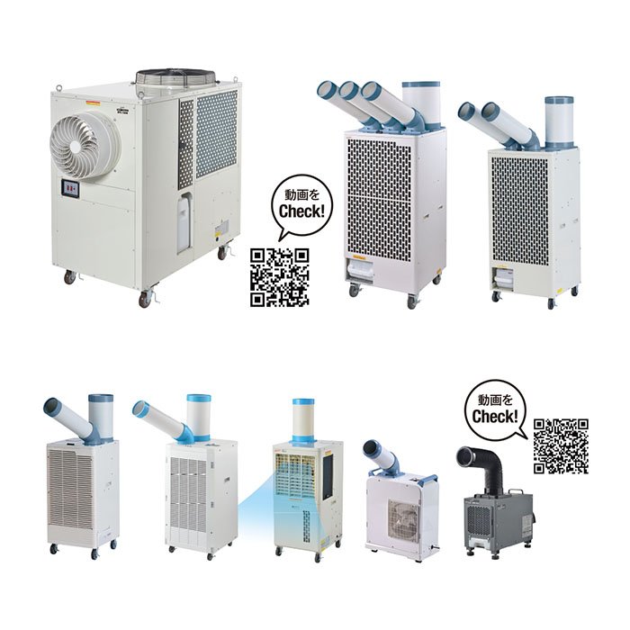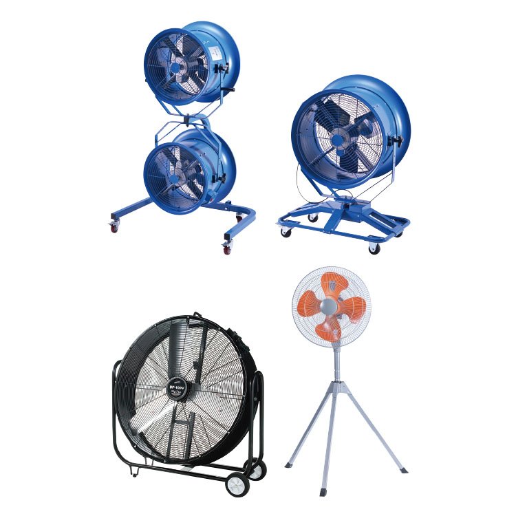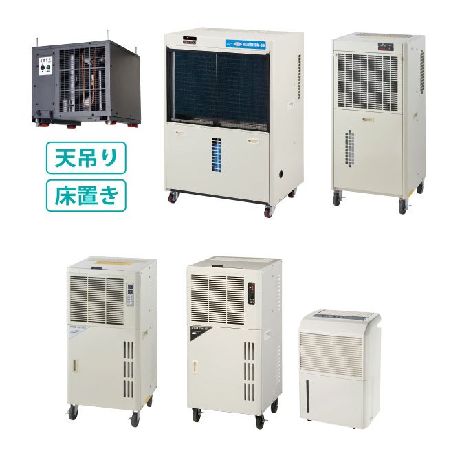 スポットクーラー、除湿機、工場扇・大型循環送風機、大型冷風扇、エアーカーテン、電気ヒーター、灯油ヒーター等の冷暖房機器