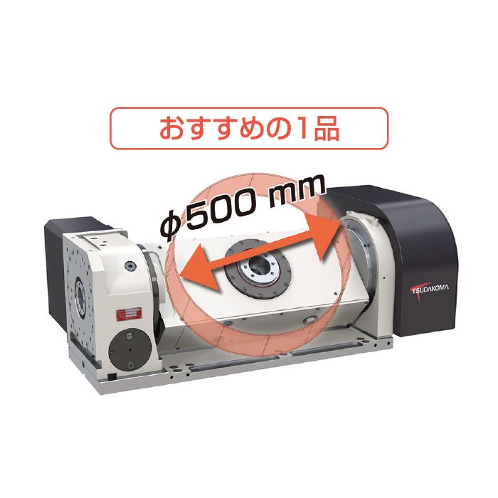 小型だが旋回径を拡大したNC傾斜円テーブル。アルミのフランジ状ワークやケーシングなど大径かつ軽量ワークの加工にお勧め。